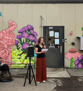 Mia Hause joined Truth Pharm in 2022 in the role of Community Arts Liaison, working to further incorporate the arts into Truth Pharm’s work, and use art as a tool to make Truth Pharm’s work more accessible to the community. She served as the lead artist for this mural project. Mia said, “As the project went on, it became all about community for me. We had a total of 24 community members involved in painting the mural throughout the month of May, and I’m so proud that so many hands are embedded in the project. The mural is truly by and for our community.”